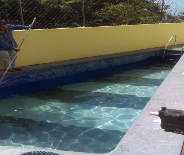 Solución: Casa de fin de semana, terreno 100% de pendiente descendente, se ubico alberca arriba y en sótano cuarto de juegos, la casa es para personas de la tercera edad, por ello la alberca arriba.